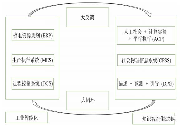 虚拟人工核电系统从工业自动化领域通过大反馈获得核电系统的物理、现场运行及社会信息等大数据, 通过机器学习、数据驱动和语言建模, 进入知识自动化领域. 知识自动化基于ACP、CPSS 及DPP等建模、计算和控制过程, 形成优化的控制决策、通过大闭环引导实际核电系统优化运行.