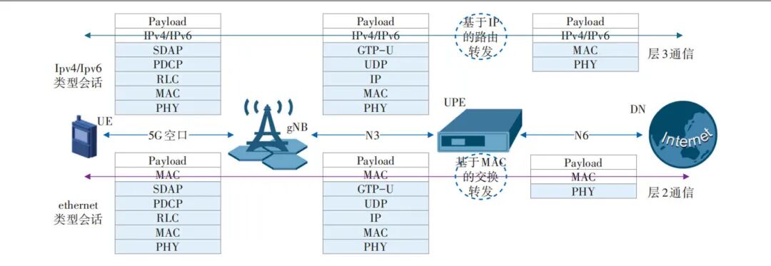 3GPP R15中,5G网络主要实现了基于IP类型会话的层三通信。为了适应工业场景中设备间层二通信的需求,需要在CPE和UPF两端架设隧道设备将工业层二协议报文封装在IP隧道报文中传输,额外引入隧道设备增加了组网复杂度和成本。