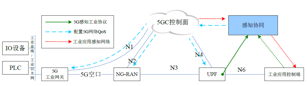 如图4所示,工业应用的控制端和工业终端之间通过5G网络互通,5G系统中增加感知协同功能模块,在UPF中增加探针感知工业协议,再针对工业数据的类型和重要程度,修改5G网络的QoS参数,实现针对工业应用的传输质量增强。