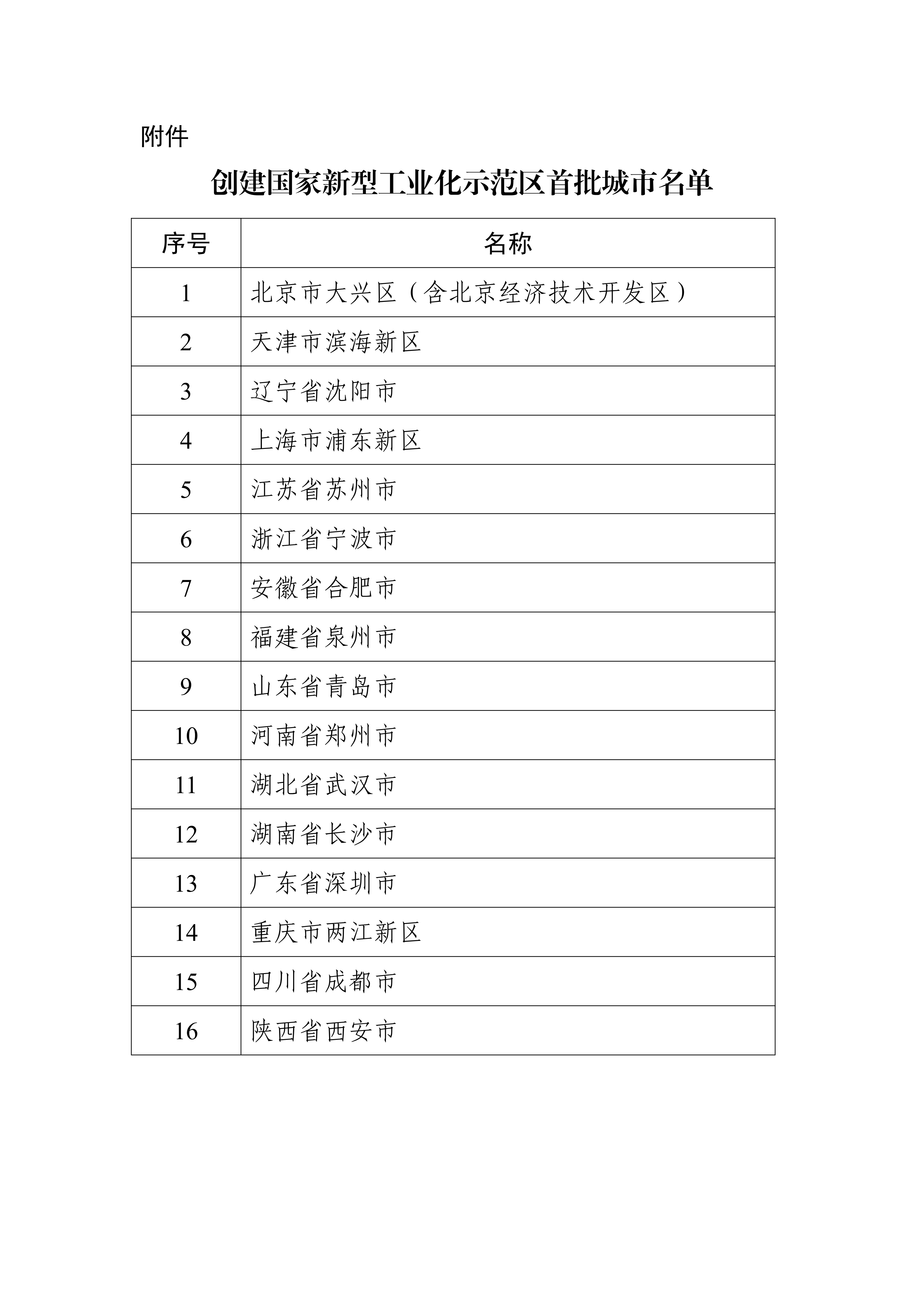 贯彻落实党中央、国务院关于加快推进新型工业化的战略部署,按照《评比表彰和创建示范活动管理办法》有关要求,经党和国家功勋荣誉表彰工作委员会办公室批准,工业和信息化部组织开展国家新型工业化示范区创建活动。依据《国家新型工业化示范区创建活动工作方案》,经省级人民政府推荐、资料审核、专家评审等程序,确定首批16个创建国家新型工业化示范区城市(以下简称创建城市),现将名单予以公布(见附件)。